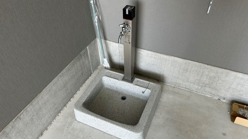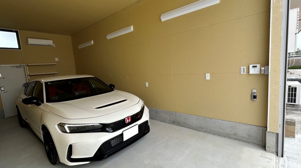 ガレージ内に水道・エアコン・TV端子・壁付可動棚・EV対応200Vコンセント